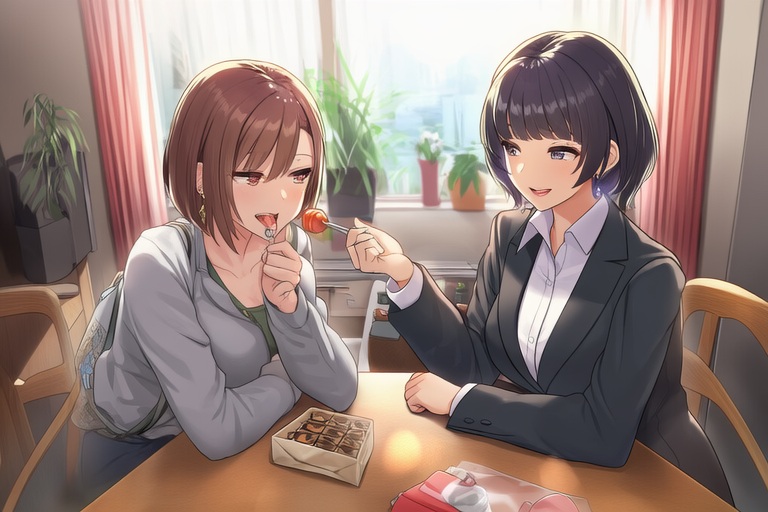 同じ部署の私と美兎は、小さな丸テーブルを挟んで向かい合って座っていました。昼食を終えた後のひとときです。コーヒーを片手に、テーブルの中央に置かれた小袋のキャンディーを眺めていました。